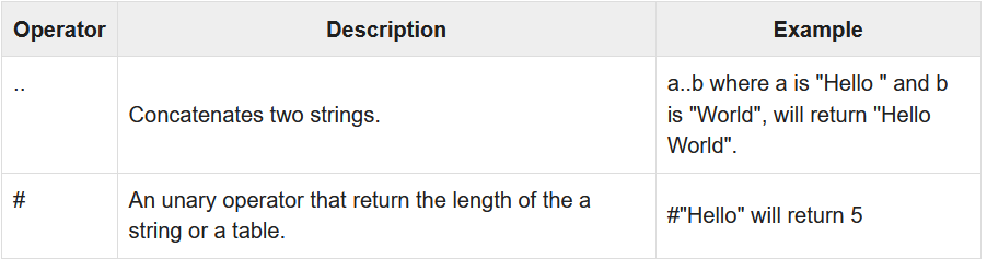 Lua에서 연산자는 Arithmetic , Relational , Logical, Misc 이 세가지 연산자로 나뉩니다.