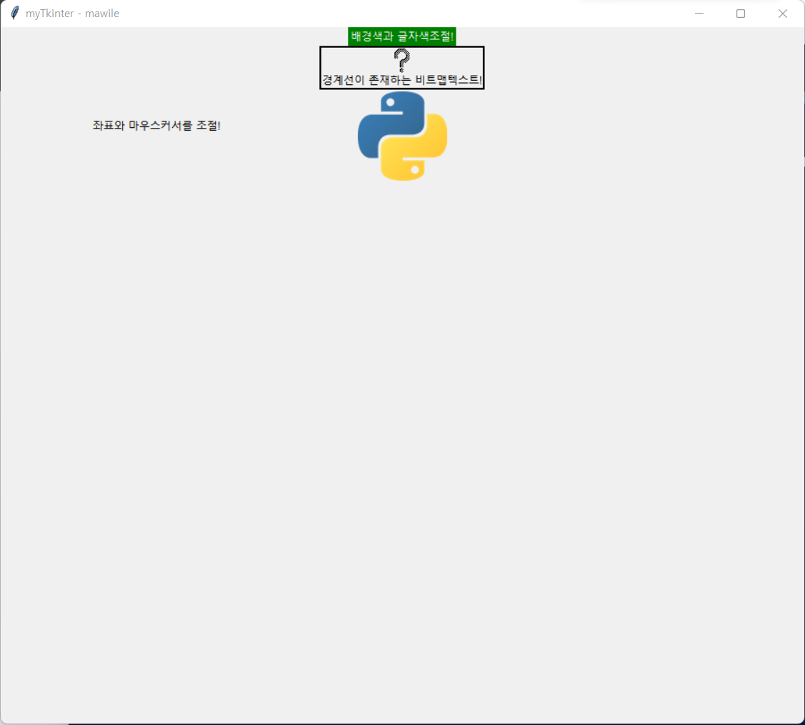 label3 = tkinter.Label(win, text = '경계선이 존재하는 비트맵텍스트!', relief = 'solid', compound = 'top', bitmap = 'question')