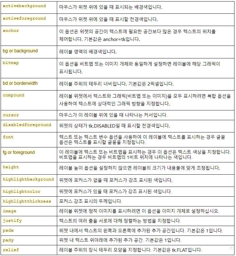 label1 = tkinter.Label(text = 'Hello Tkinter!') # 설정