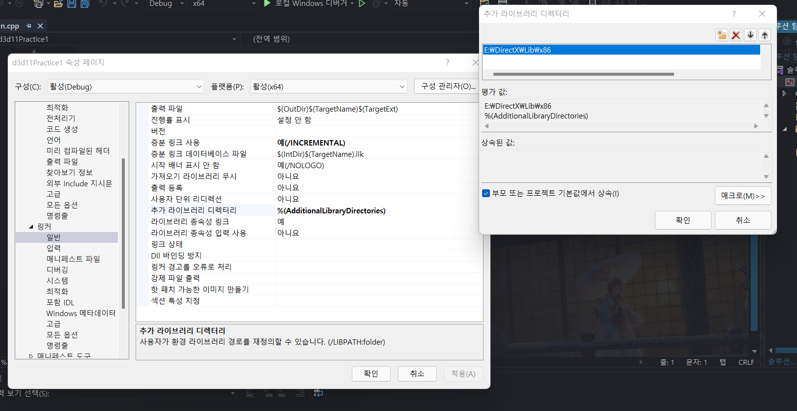 이제부터 사진에 따라 우리가 설치한 DirectX의 경로에 맞춰서 라이브러리참조와 헤더파일을 연결해줍니다.