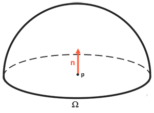 반사율 방정식은 우리가 빛을 측정하는 모든 입사 광도의 합인 방사광을 기반으로 한다. 단일 입사광 방향뿐만 아니라 점 p를 중심으로 한 반구 Ω 내의 모든 입사광 방향도 마찬가지입니다. 반구는 표면의 법선 n을 중심으로 정렬된 반구라고 할 수 있다.