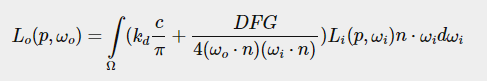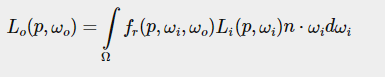 이제 알려지지 않은 유일한 왼쪽은 표면의 재료 특성에 따라 들어오는 광도를 스케일링하거나 무게를 측정하는 BRDF 또는 양방향 반사 분포 함수로 알려진 fr 기호이다.