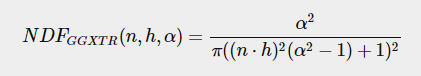 정규 분포 함수 D는 통계적으로 (반쪽) 벡터 h에 정확히 정렬된 미세 면의 상대 표면적을 근사한다. 약간의 거칠기 매개 변수가 주어진 미세 면의 일반적인 정렬을 통계적으로 근사하는 다수의 NDF가 있으며, 우리가 사용할 NDF는 Trowbridge-Reitz GGX로 알려져 있다.
