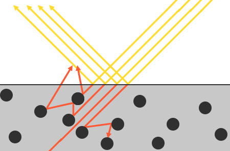 일반적으로 모든 에너지가 흡수되는 것은 아니며, 빛은 에너지가 고갈되거나 다시 표면을 떠날 때까지 다른 입자와 충돌하는 (대부분) 임의의 방향으로 계속 산란한다. 표면에서 다시 나오는 광선은 표면의 관찰된 (확산된) 색에 기여한다. 그러나 물리적 기반 렌더링에서, 우리는 모든 굴절된 빛이 아주 작은 충격 영역에서 흡수되고 산란된다고 가정하고, 멀리 떨어진 표면에서 빠져나올 산란된 빛의 영향을 무시한다. 이를 고려한 특정 셰이더 기법은 피부, 대리석 또는 왁스 같은 재료의 시각적 품질을 크게 향상시키는 지하 산란 기법으로 알려져 있지만, 성능에 대한 대가를 치르게 된다.