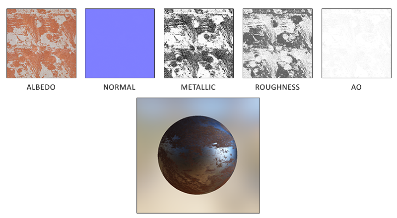 PBR의 기본 수학적 모델에 대한 지식을 바탕으로 예술가들이 일반적으로 PBR 방정식에 직접 공급할 수 있는 표면의 물리적 특성을 어떻게 작성하는지 설명함으로써 논의를 마무리할 것이다. PBR 파이프라인에 필요한 각 표면 매개변수는 텍스처에 의해 정의되거나 모델링될 수 있다. 텍스처를 사용하면 각 특정 표면 점이 빛에 어떻게 반응해야 하는지, 즉 금속성, 거칠거나 매끄러운지 또는 표면이 다른 파장의 빛에 어떻게 반응하는지 조각별로 제어할 수 있습니다.