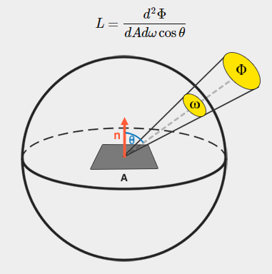 복사 유량, 복사 강도 및 고체 각도에 대한 지식을 통해 우리는 마침내 복사 방정식을 설명할 수 있다. 광도는 복사 강도 λ의 빛의 고체 각도 ω에 대한 영역 A에서 관측된 총 에너지로 설명된다.