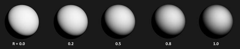 Schlick-GGX를 Gsub로 사용한 스미스의 방법을 사용하면 다양한 거칠기 R에 대해 다음과 같은 시각적 외관을 얻을 수 있다.