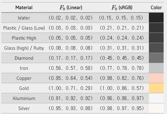 정상 발생(normal incidence) 시 표면의 반응 또는 기본 반사율은 다음과 같은 대형 데이터베이스에서 찾을 수 있으며, Naty Hoffman의 코스 노트에서 가져온 다음과 같은 더 일반적인 값 중 일부를 확인할 수 있다.