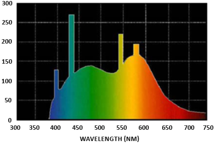 복사 유량: 복사 유량 Φ는 와트로 측정된 광원의 투과 에너지이다. 빛은 여러 다른 파장에 걸친 에너지의 총합으로, 각각의 파장은 특정한 (보이는) 색과 연관되어 있다. 따라서 광원의 방출 에너지는 모든 다른 파장의 함수로 생각할 수 있다. 390nm에서 700nm 사이의 파장은 가시광선 스펙트럼의 일부로 간주된다. 아래에서 일광의 파장당 다른 에너지의 이미지를 볼 수 있습니다.