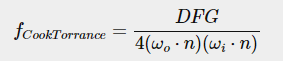 Cook-Torrance 분광형 BRDF는 분모에서 세 가지 함수와 정규화 계수로 구성된다. D, F 및 G 기호는 각각 표면의 반사 특성의 특정 부분을 근사하는 함수의 유형을 나타낸다. 정규 분포 함수, 프레넬 방정식 및 지오메트리 함수로 정의됩니다.