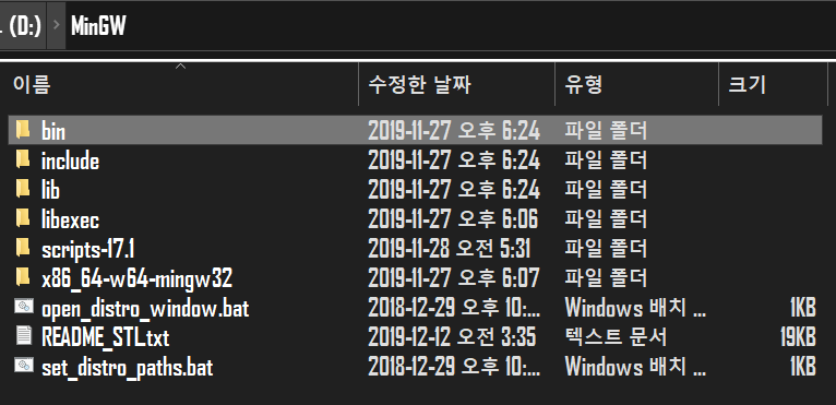 그다음 MINGW/bin의경로를 입력해준후, 확인 을 눌러줍니다