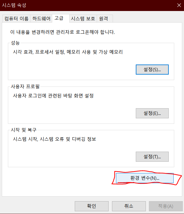 그다음 윈도우키를 누르고, "환경" 이라고 쳐주면 이렇게 나오는데 "시스템 환경 변수 편집"을 눌러줍니다!