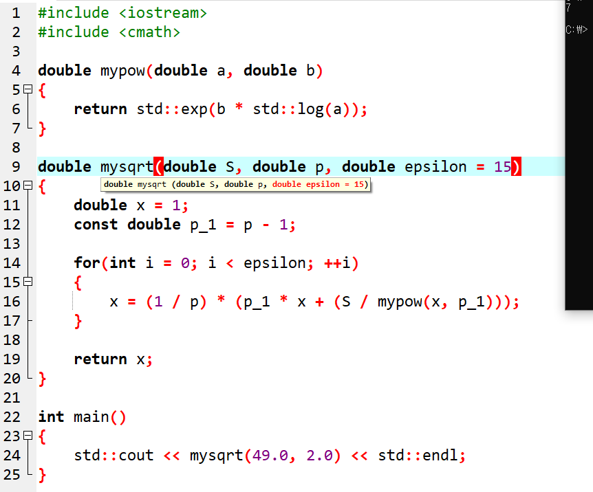 std::cout << mysqrt(49.0, 2.0) << std::endl;
